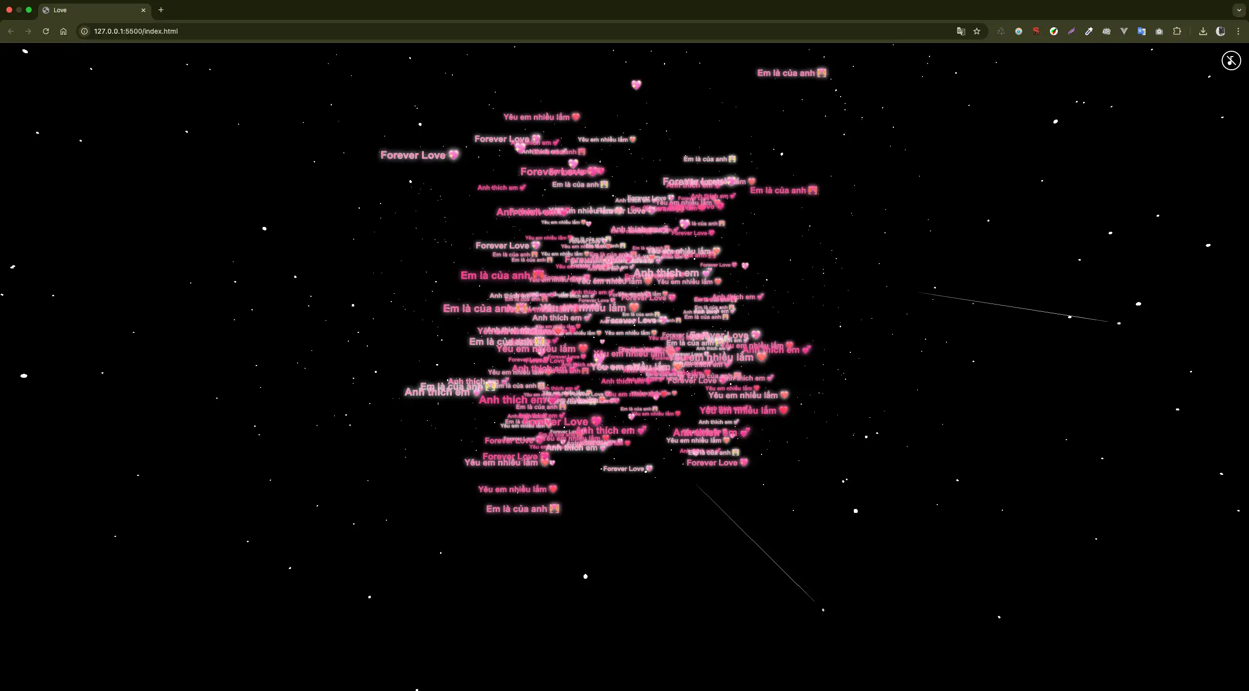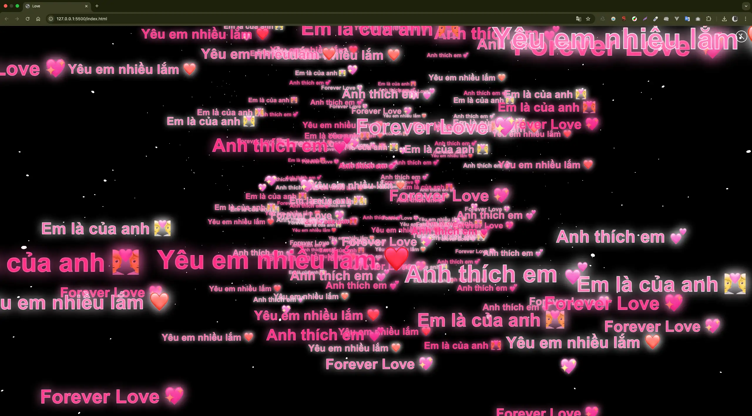 Đoạn code này sử dụng HTML, CSS và JavaScript thuần, không phụ thuộc thư viện ngoài nên rất nhẹ, dễ chạy và tương thích tốt trên cả máy tính lẫn điện thoại. Khi mở trang web, người xem sẽ thấy phông nền tối huyền ảo cùng hàng loạt câu nói yêu thương như “Anh thích em”, “Yêu em nhiều lắm”, “Em là của anh”, “Forever Love” rơi nhẹ nhàng từ trên xuống, kết hợp hiệu ứng phát sáng tạo cảm giác lung linh và cảm xúc.