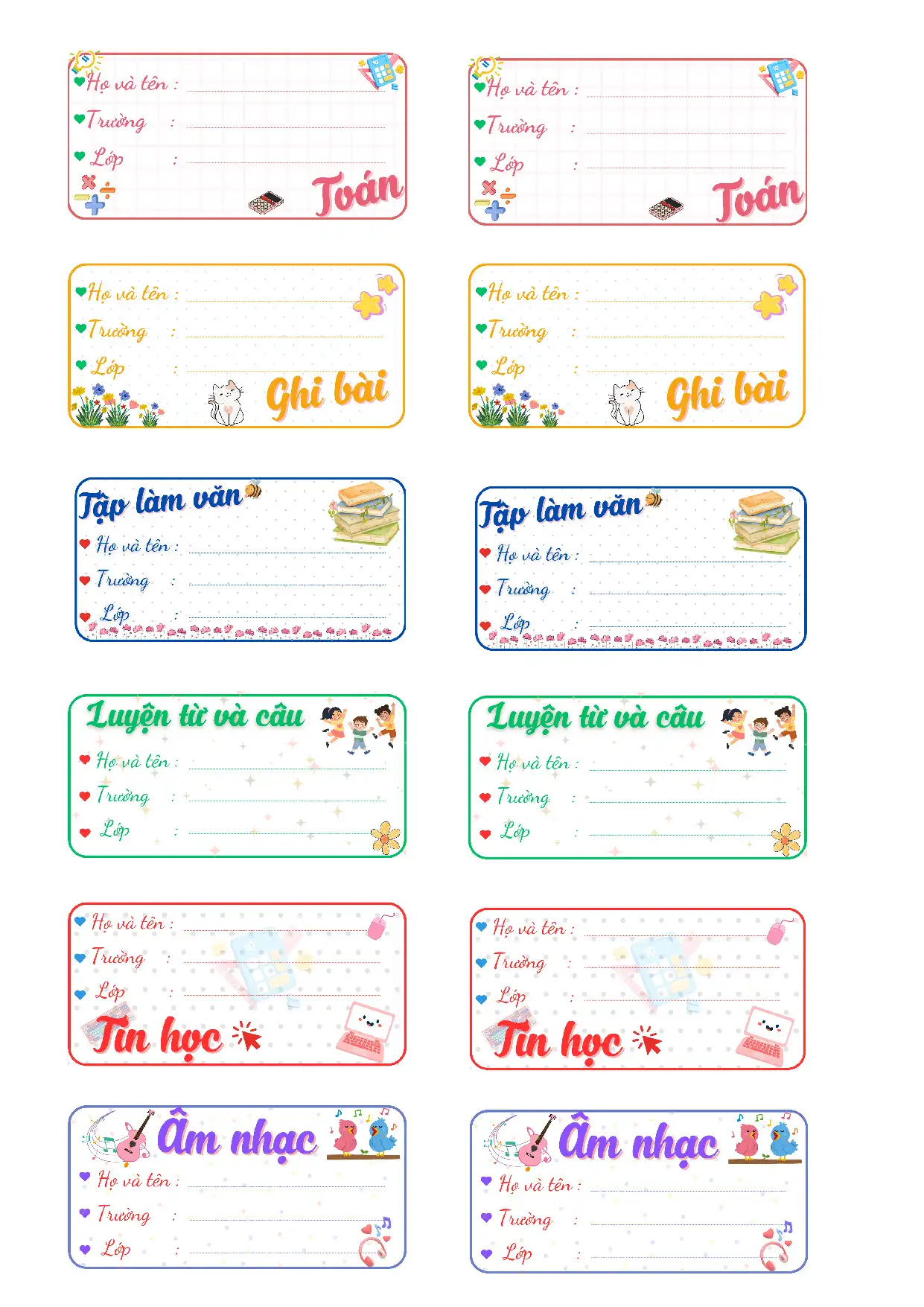 Mỗi trang: 6 nhãn vở cùng kích thước