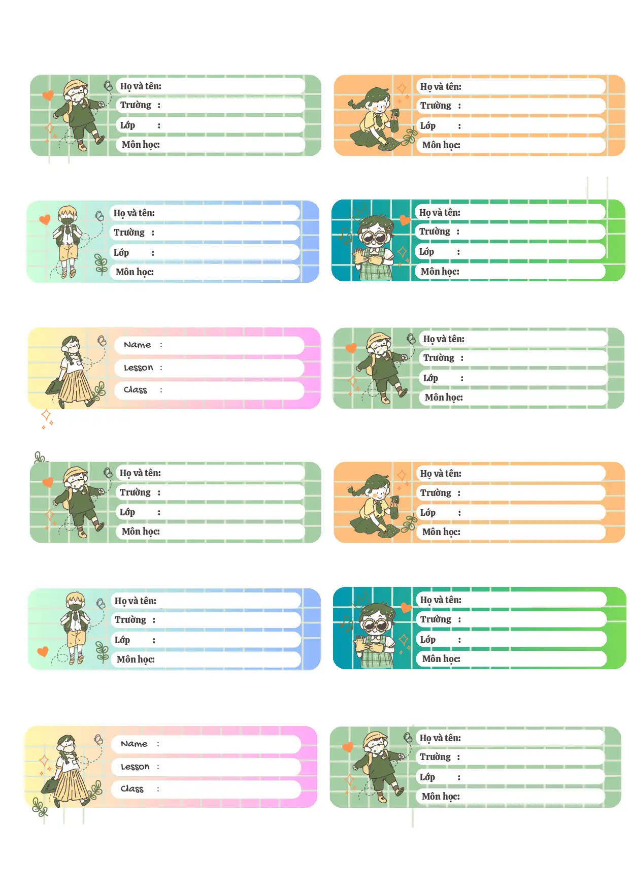 Các mẫu nhãn vở trong file PDF được thiết kế với màu sắc nhẹ nhàng, hình minh họa đáng yêu, phù hợp với lứa tuổi học sinh. Bố cục nhãn rõ ràng, có sẵn các dòng thông tin như: Họ và tên, Trường, Lớp, giúp phụ huynh và học sinh điền nhanh, không mất thời gian căn chỉnh.