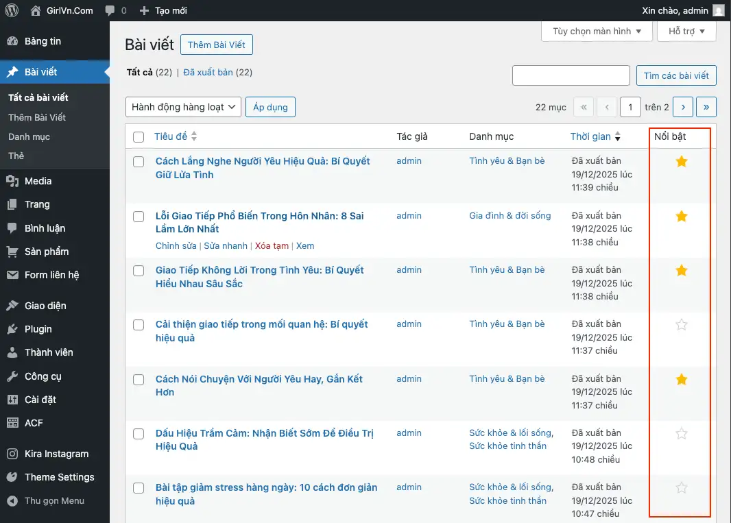 • Đánh dấu bài viết nổi bật và bỏ nổi bật ngay trong danh sách bài viết của admin WordPress