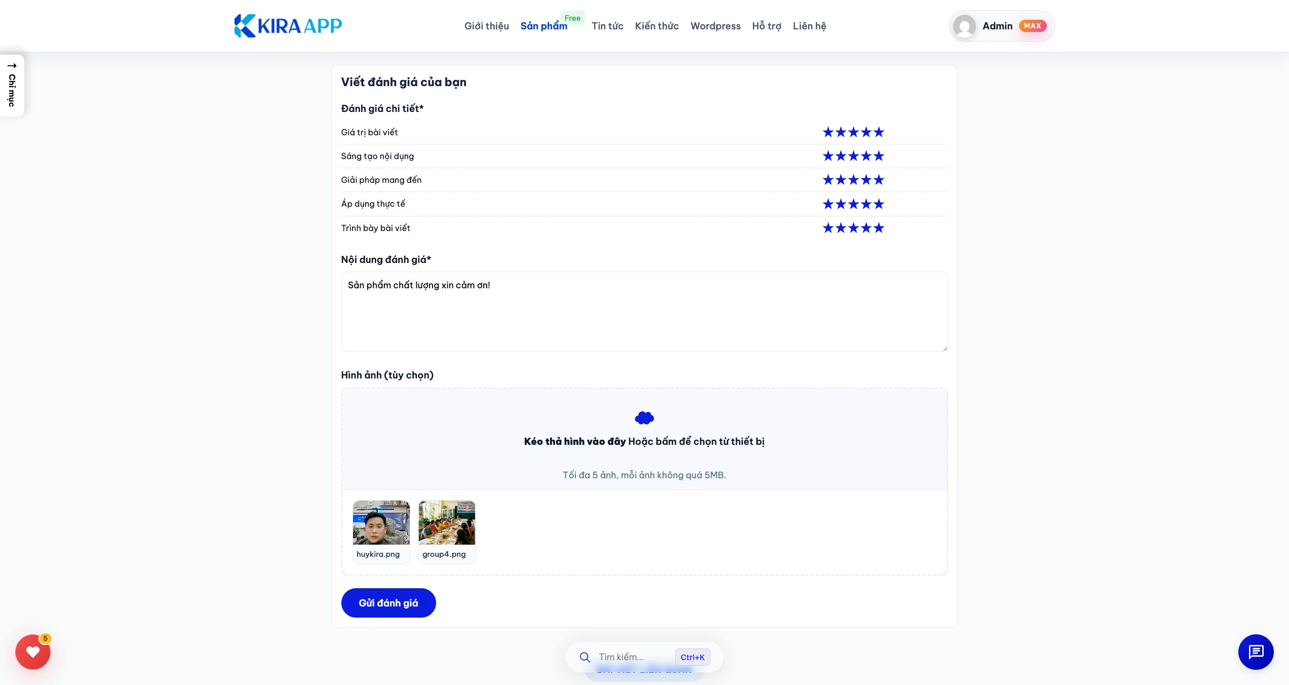 Mình mới dùng thử plugin Kira Review này được vài ngày mà thấy thích quá. Cái form đánh giá chuyên nghiệp, dễ tùy chỉnh, lại còn cho phép người dùng đăng ảnh nữa chứ. Trước giờ mình toàn phải dùng plugin free, nhìn form đánh giá chán đời. Giờ thì khác rồi, website của mình nhìn chuyên nghiệp hẳn ra. Chấm 5 sao cho Kira Review!