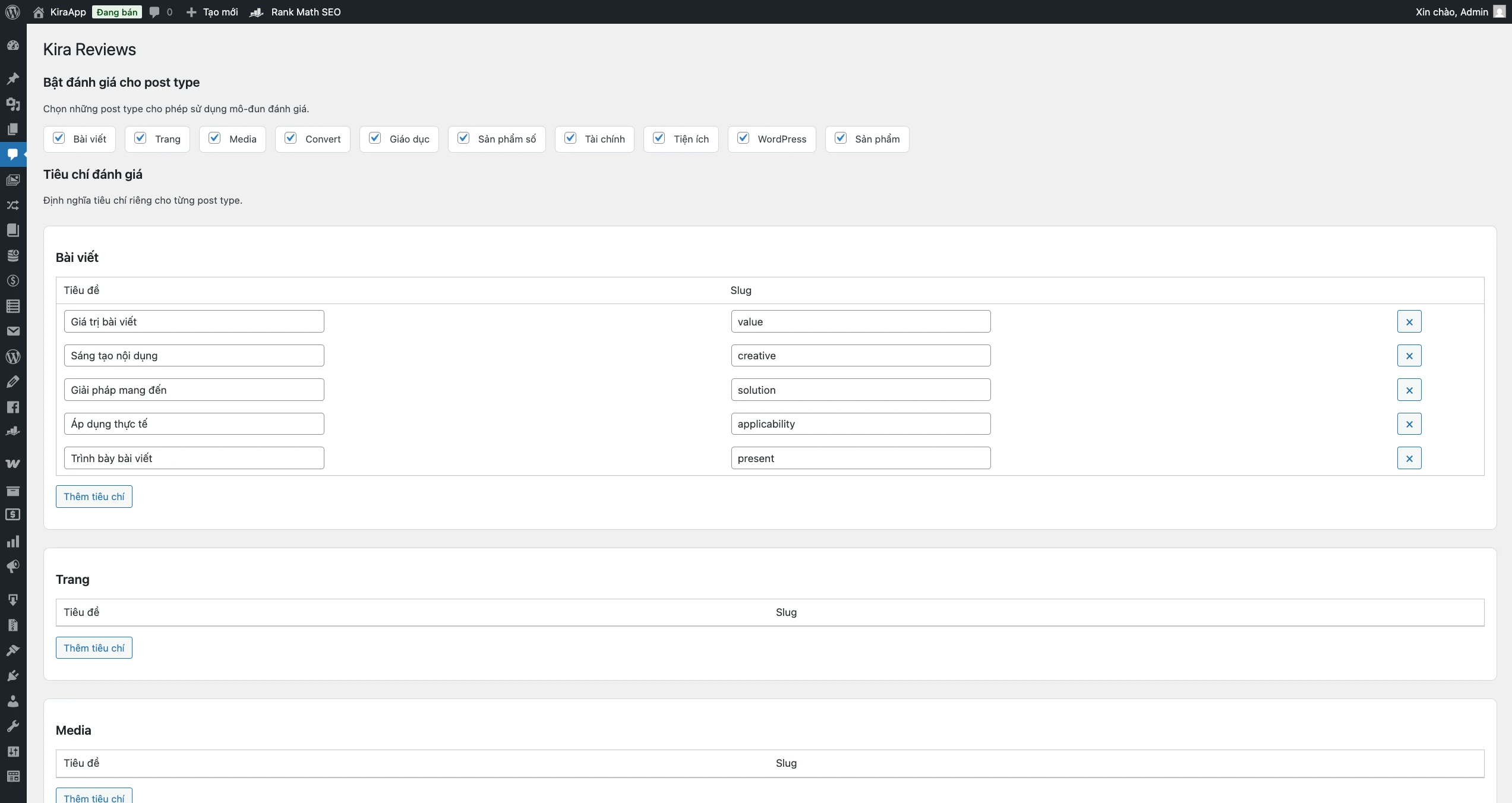 - Cài đặt các tiêu chí riêng cho từng post type: Linh hoạt tùy chỉnh tiêu chí đánh giá cho từng loại nội dung (bài viết, sản phẩm,…).