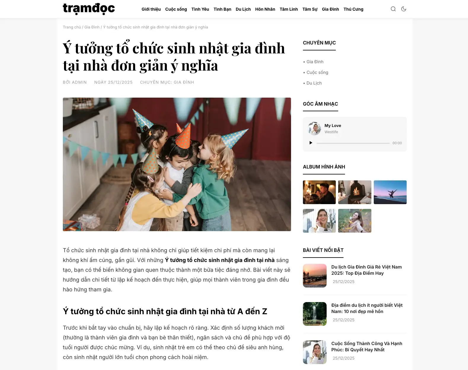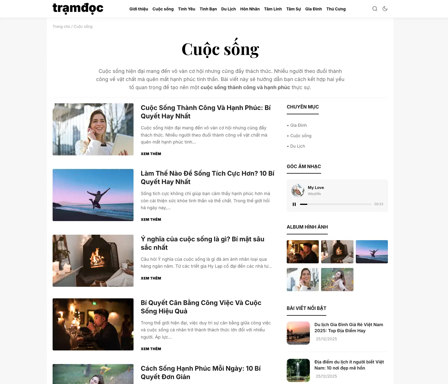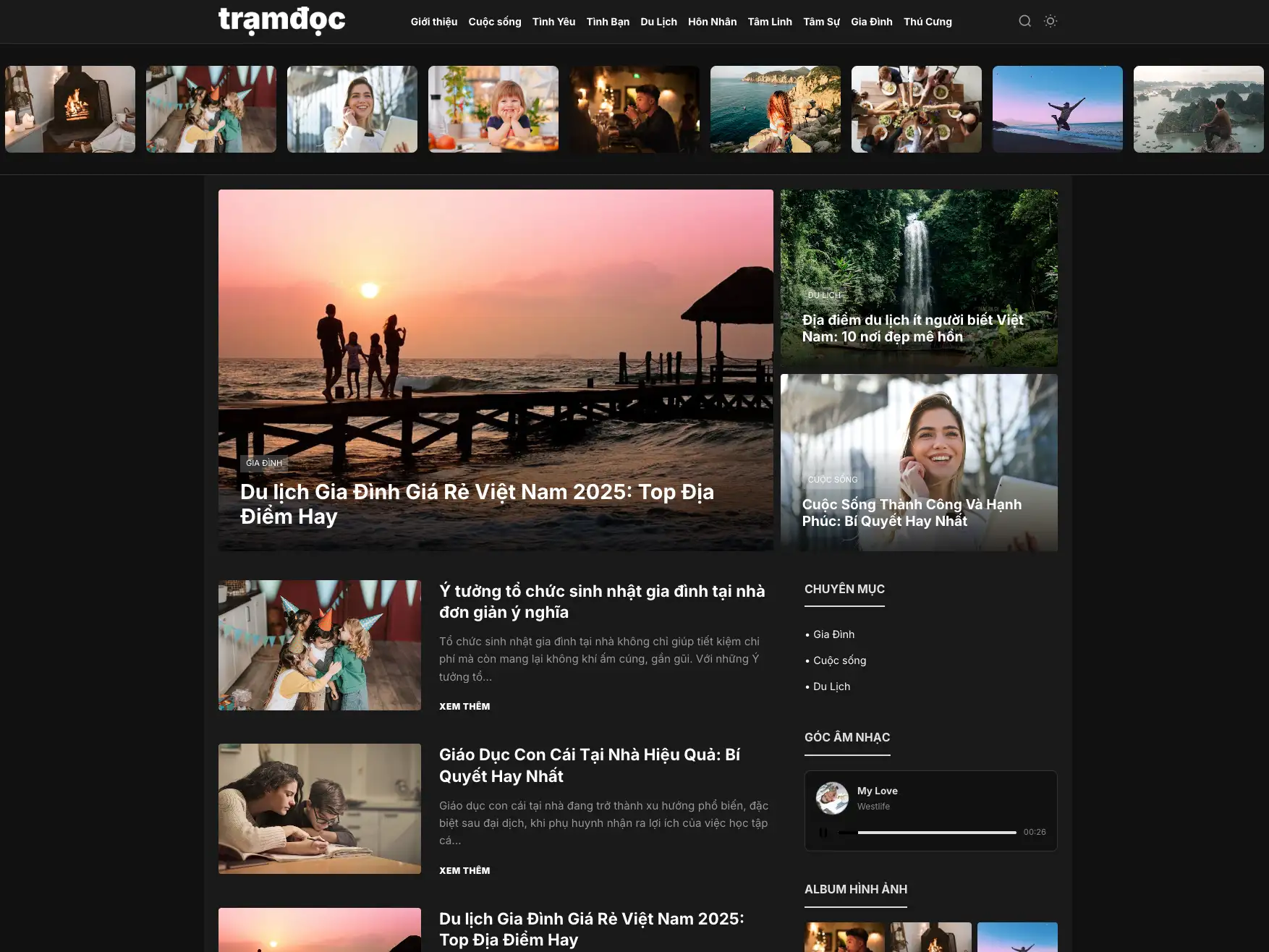 Danh mục hiển thị rõ ràng: Gia đình, Cuộc sống, Du lịch, Tâm sự…